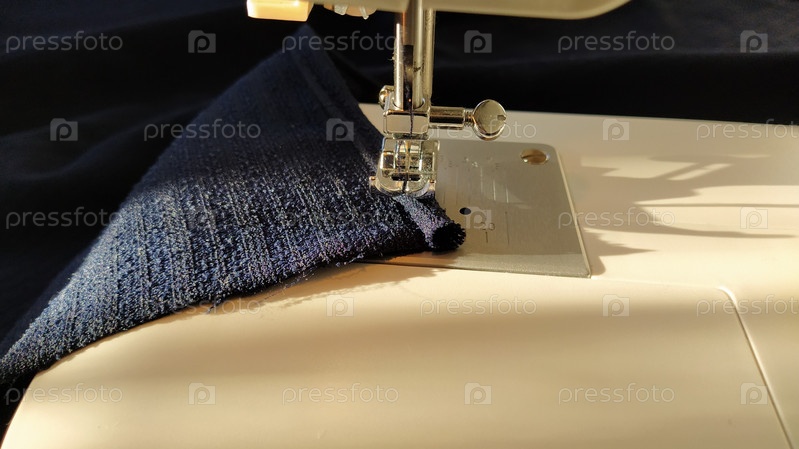 Процесс шитья на современной швейной машине, крупный план. Лапка для швейной машины с иглой. Ткань темно-синего цвета отделана двойным завертыванием края ткани. Естественный солнечный свет