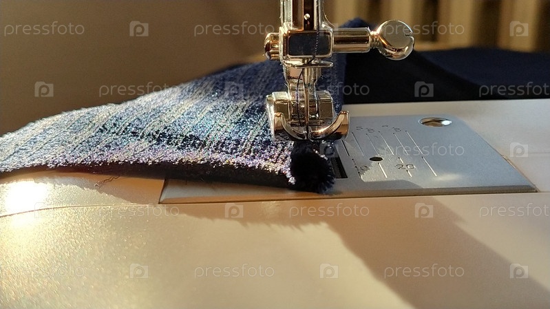 Процесс шитья на современной швейной машине, крупный план. Лапка для швейной машины с иглой. Ткань темно-синего цвета отделана двойным завертыванием края ткани. Естественный солнечный свет
