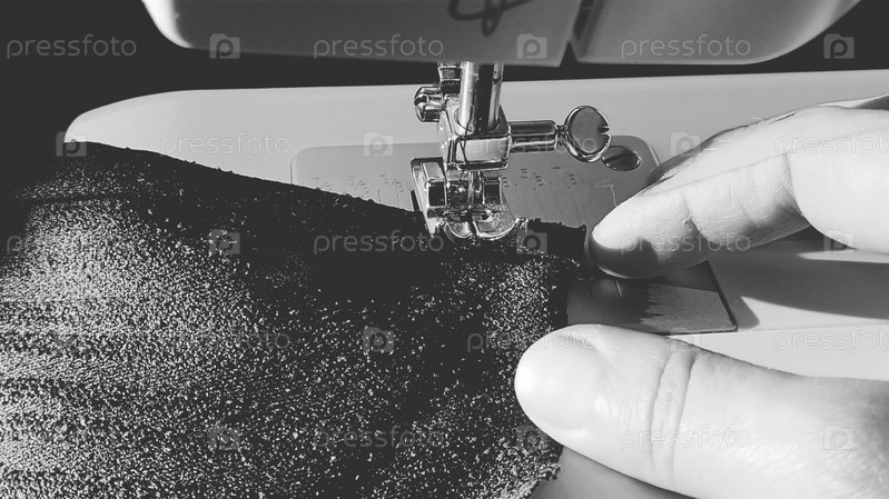 Процесс шитья на современной швейной машине, крупный план. Лапка для швейной машины с иглой. Ткань темно-синего цвета отделана двойным завертыванием края ткани. Естественный солнечный свет