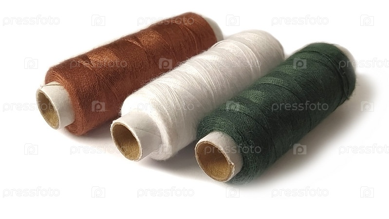 Шпульки и катушки ниток разных цветов - коричневого, белого и зеленого. Крупный план. Естественный свет слева. Выделить на белом фоне с легкой тенью. Мотки ниток. Швейные принадлежности. Текстильное производство