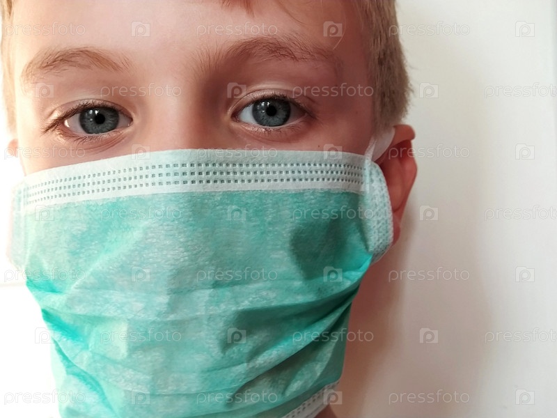 Ребенок в маске. Лицо 7-летнего мальчика в защитной хирургической маске крупным планом. Школьник со светлыми волосами и серо-голубыми глазами на белом фоне. Глядя в камеру