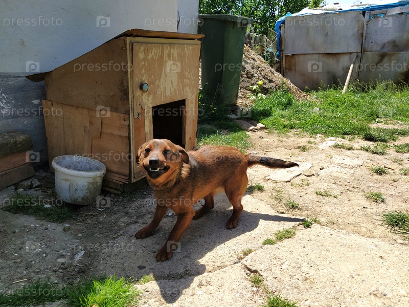 Рыжая короткая собака на поводке в сельском дворе. Эмоции собаки. Радость животного при виде хозяина. Конура и свалка на заднем плане