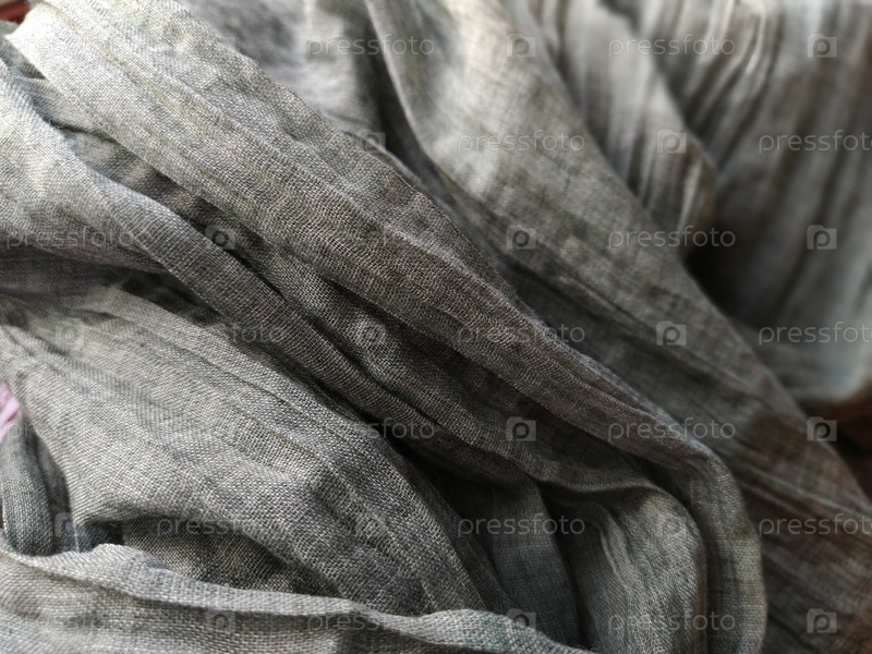 Ткань прозрачная портьерная. Красивый серый цвет. Материал штор небрежно сложен и помят. Образец ткани. Вариант оформления интерьера