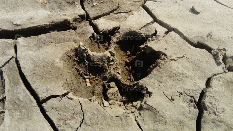 След собаки на земле. Отпечатки подошв и лап животного в грязи рядом с прудом. Потрескавшаяся земля. Животное прошло по мокрому песку. Отпечаток одной лапы