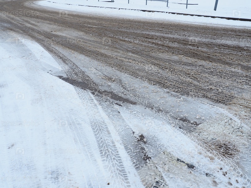 Развилка или разъезд с кольцевой развязки. Сугробы на обочине дороги. Плохая погода. Снег на асфальте. Сложные условия вождения и дорожного движения. Зимняя слякоть на дороге. Тормозной путь автомобиля