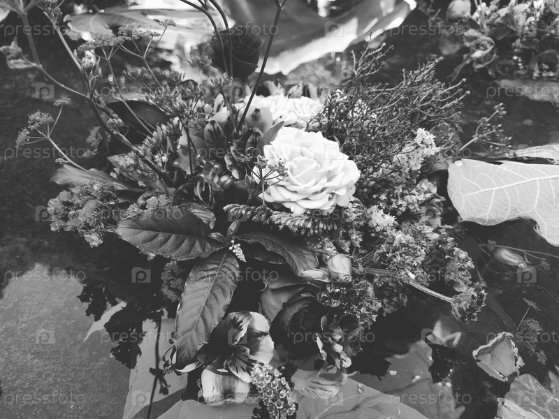 Букет роз, плавающих в воде пруда. Сорванные бутоны как украшение для летнего отдыха. Иван Купала праздник летнего солнцестояния. Черно-белая монохромная фотография в ретро-винтажном стиле