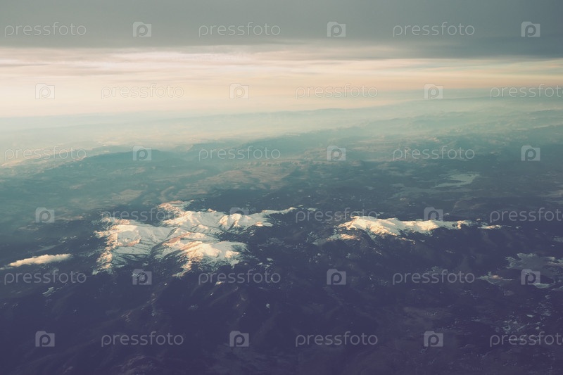 Турция, Анкара. Вид из окна самолета на турецкие горы, озера и снежные вершины. Слоистые облака и горизонт. Озера Сарыар, Наллихан и Камлидере. Вылет из аэропорта Эсенбога Хавалимани