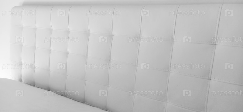 Мягкое изголовье. Обивка для мебели из натуральной или искусственной кожи и стеганой ткани. Мягкое изголовье у светлой стены. Черно-белое монохромное фото