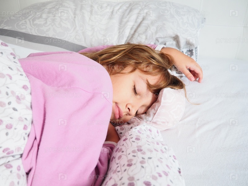 Красивая кавказская девочка 8 лет со светлыми волосами, одетая в розовую пижаму, спит на кровати с пушистым одеялом, обнимая подушку. Мягкий свет утреннего солнца струится через окно