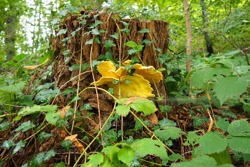 Лисичка обыкновенная, или лисичка настоящая, или петух Cantharellus cibarius вид грибов семейства лисичек. Съедобный оранжевый гриб. Гора Гучево, Сербия