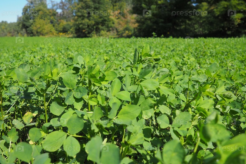Поле с зеленым клевером. Организованная посадка клевера. Clover Trifolium, род растений семейства бобовых Fabaceae, Moth Faboideae. Медонос сельскохозяйственных культур, кормовое растение, сидераты