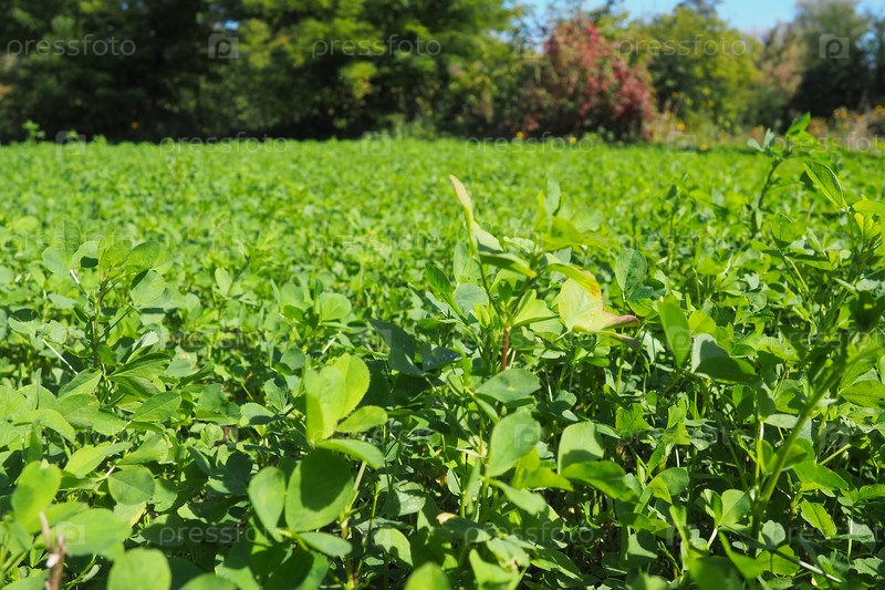 Поле с зеленым клевером. Организованная посадка клевера. Clover Trifolium, род растений семейства бобовых Fabaceae, Moth Faboideae. Медонос сельскохозяйственных культур, кормовое растение, сидераты