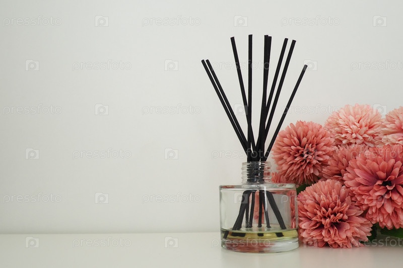 Композиция с ароматическими палочками, эфирным маслом в стеклянной вазе и розовыми махровыми искусственными цветами в интерьере белой комнаты. Белый фон. Много цветов и ароматических палочек. Скопируйте пространство