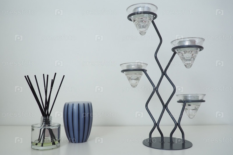 Высокая металлическая люстра со стеклянными подсвечниками. Белый фон. Ароматические палочки в стеклянном кубическом сосуде с эфирным маслом. Декор интерьера. Ароматическая серая полосатая свеча или ваза