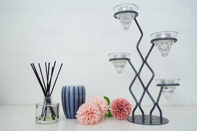 Композиция с ароматическими палочками, эфирным маслом в стеклянной вазе и розовыми махровыми искусственными цветами. Высокая металлическая люстра со стеклянными подсвечниками. Ароматическая серая полосатая свеча или ваза