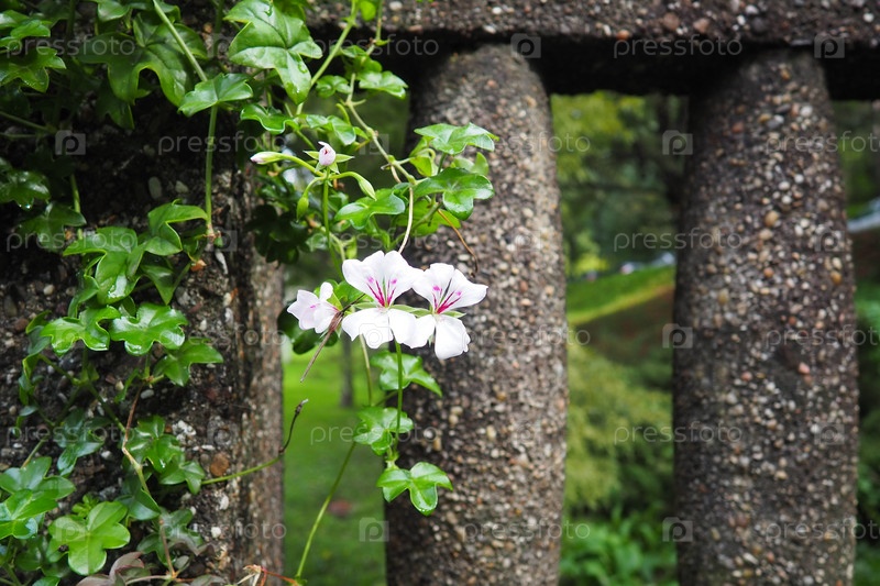 Цветущая белая плющелистная герань-пеларгония в вертикальном дизайне озеленения улиц и парков. Красивая крупная пеларгония-герань-герань. Цветоводство и садоводство. Баня Ковиляча