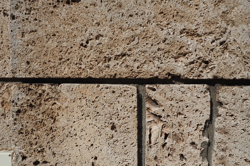 Текстурированная стена, облицованная бежевой плиткой из ракушечника. Крупный план стены из древнего ракушечника. Отверстия, неровности природного строительного материала. Церковная стена в Баня-Ковиляче, Сербия