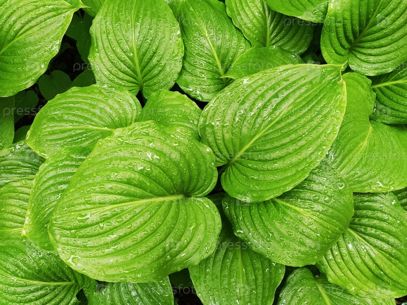 Хоста, род многолетних травянистых растений семейства Спаржевые. Садоводство и ландшафтный дизайн. Теневыносливые декоративно-лиственные растения. Зеленые листья с каплями воды
