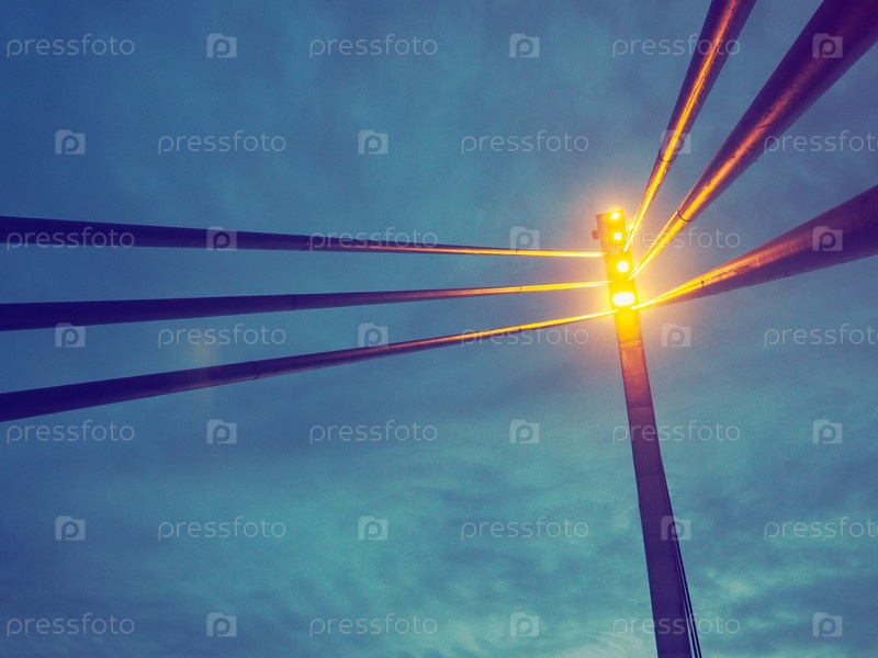 Прожекторы на мосту. Портативная светодиодная вышка. Пешеходный мост Святого Иринея через реку Сава, Сремска-Митровица, Сербия. Вечернее голубое небо с облаками. Металлические столбы и балки, перспектива