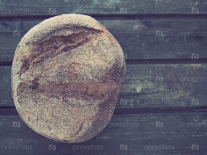 Вид сверху на круглый хлеб. Вкусный свежий кукурузный хлеб с посыпкой на старом деревянном столе. Скопируйте пространство. Традиционные рецепты. Хлеб ручной работы