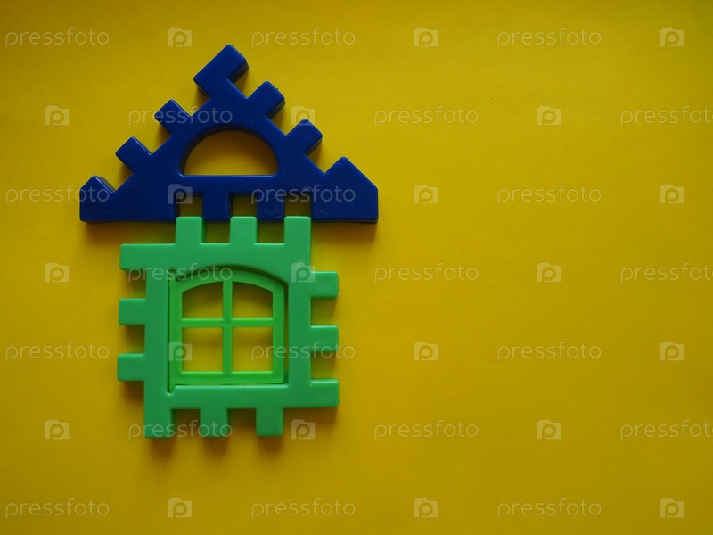 Разноцветный пластиковый детский конструктор на желтом фоне. Цветные детские кубики для строительства. Плоское пространство для копирования сверху. Фон из пластиковых строительных блоков. Развивающие игрушки, игра