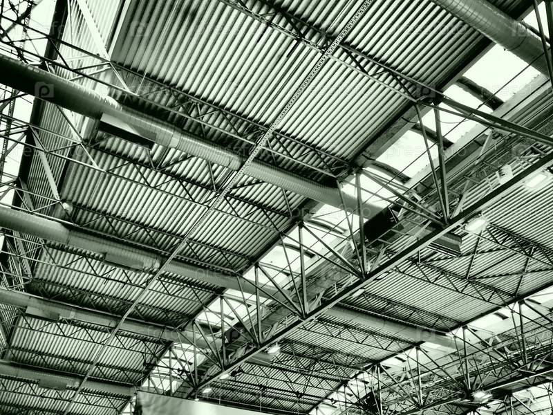 Крыша ангара, производственного или спортивного зала. Металлоконструкции, балки, опорные элементы. Системы вентиляции в больших залах и помещениях. Мансардные окна. Индустриальный интерьер