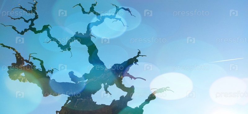 Силуэт дерева без листьев на фоне голубого неба. Боке или эффект снежинки. Фон
