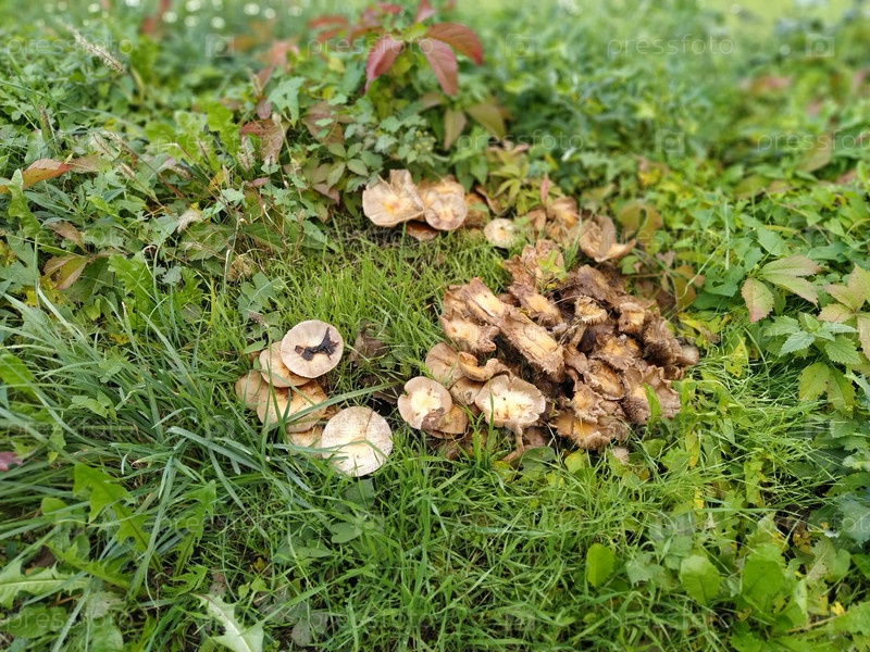 Колонии лесных грибов в листве и траве. Смешанный лес