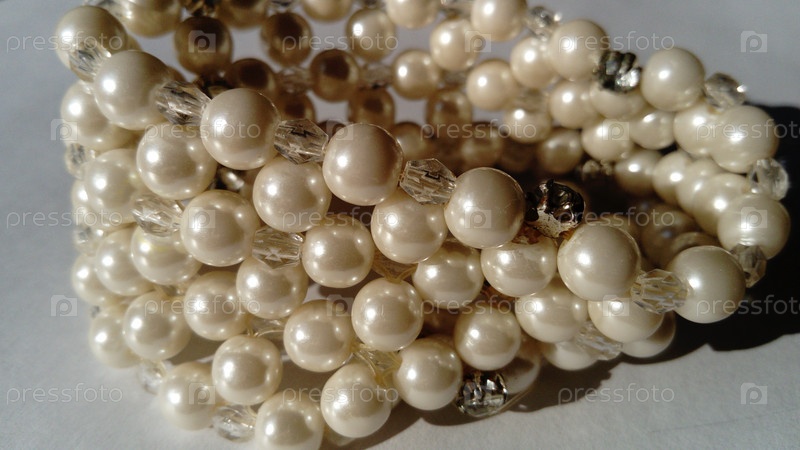 Женский браслет из белого жемчуга. Женственный дизайн. Белый фон