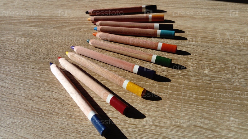 На деревянном столе лежат несколько деревянных толстых цветных карандашей