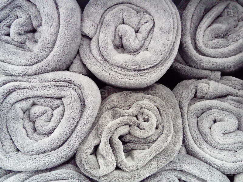 Серые одеяла, свернутые и лежащие на полке в магазине. Скандинавский образ жизни. Элементы декора интерьера. Теплые одеяла