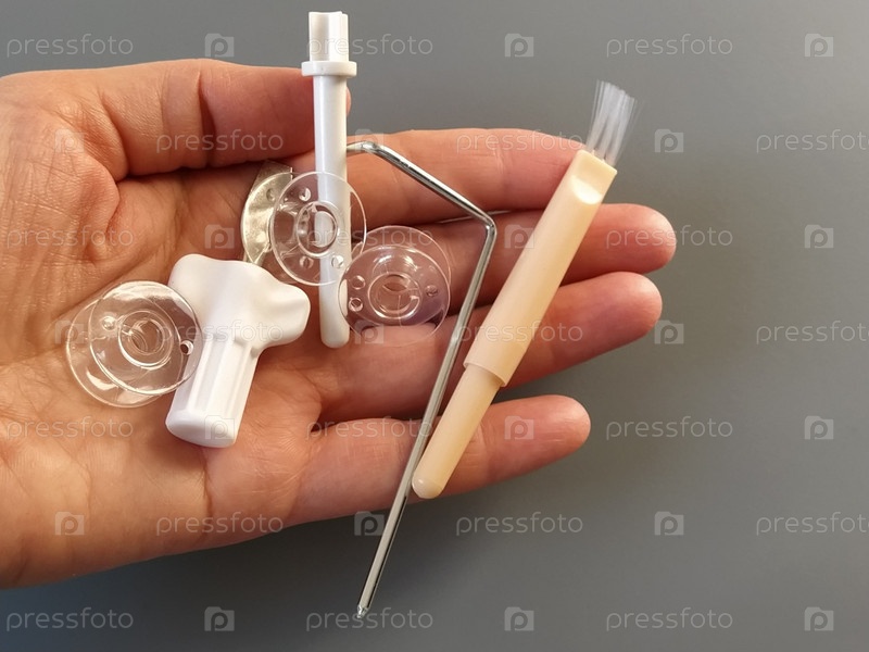 Прозрачные пластиковые шпульки от современной швейной машины в ладони женщины - швеи, иглы, нитепритягиватель, инструмент для взбивания. Серый фон. швейные машинки