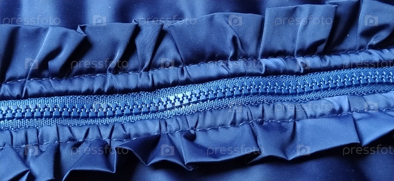 Молния на пуговицах на синем плаще. Волны и складки на ткани. Красивые воланы, рюши, оборки. Декоративная отделка изделия. Присборенная, сшитая шелковая ткань. Хорошая повседневная одежда. Баннер