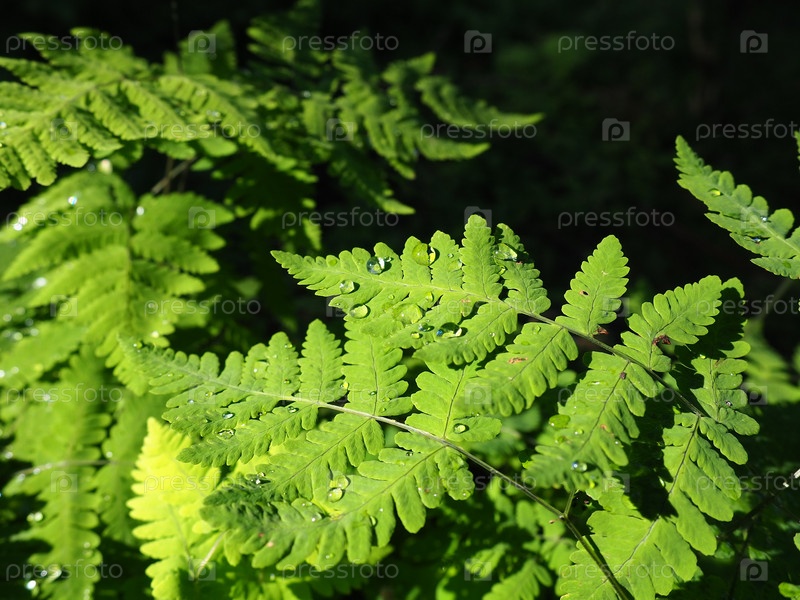 Капли дождя или росы на листьях папоротника. Красивые, легкие, изящные ветки папоротника. Закрыть. Папоротники нижнего яруса леса. Солнечные лучи в тайге. Молодые зеленые ветки и листья лесного папоротника