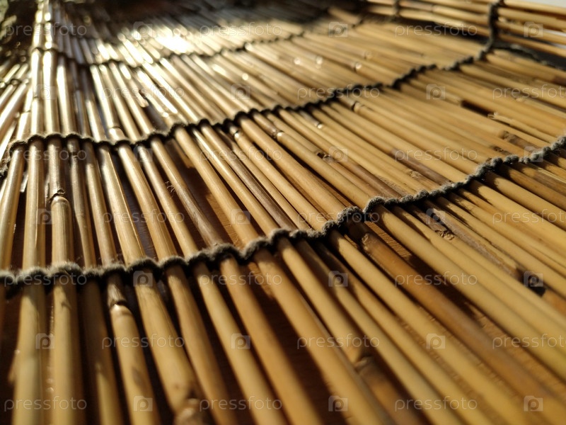 Соломенная подстилка, скатерть или небольшой коврик, разложенный на столе и сфотографированный сбоку. Мягкий вечерний солнечный свет отражается от стеблей. Некоторые палочки сломаны, нитки и веревки сплетены