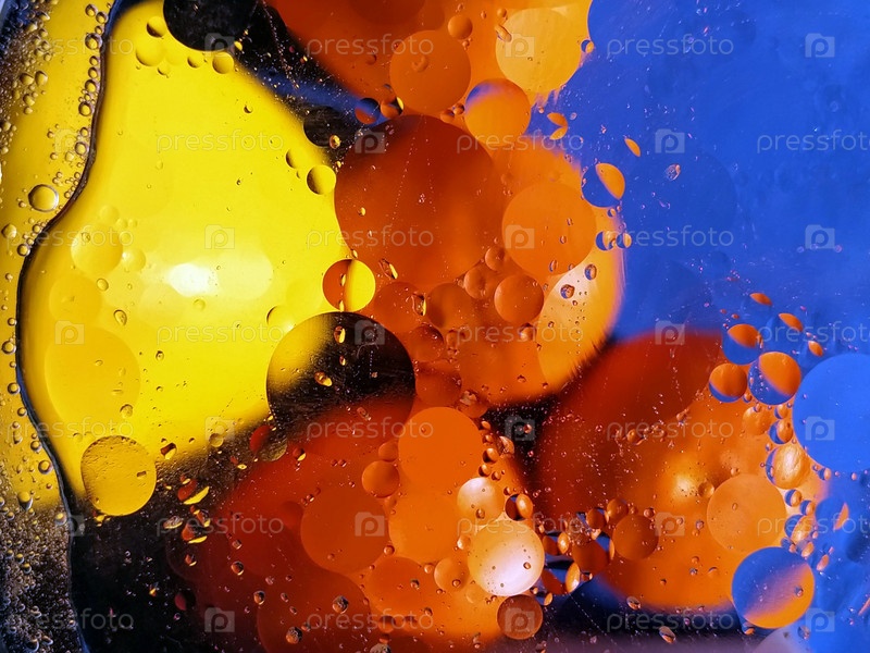 Фрукты под стеклом, вода и растительное масло. Размытый синий фон. Яркие апельсины и мандарины. Нефтяные круги на воде. Абстрактное изображение. Горизонтальная фотография