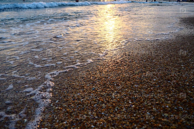 Пенные волны перекатываются по песчаному берегу. Закат над морем. Красивый закат. туристическое место, курорт. Солнечные лучи отражаются от воды. Песчаный вечерний пляж с ракушками в золотой час