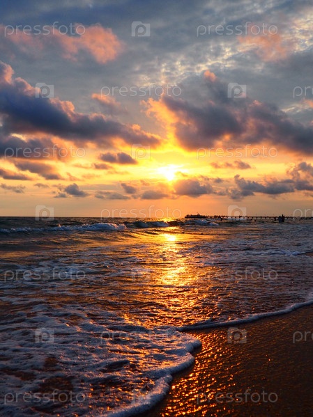 Закат над морем. Красивый закат. Пенные волны перекатываются по песчаному берегу. Витязево, Анапа, Черное море. Туристическая Мекка, курорт. Красочные облака в вечернем небе. Лучи отражаются от воды