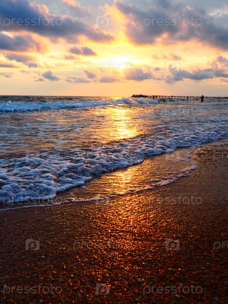 Закат над морем. Красивый закат. Пенные волны перекатываются по песчаному берегу. Витязево, Анапа, Черное море. Туристическая Мекка, курорт. Красочные облака в вечернем небе. Лучи отражаются от воды