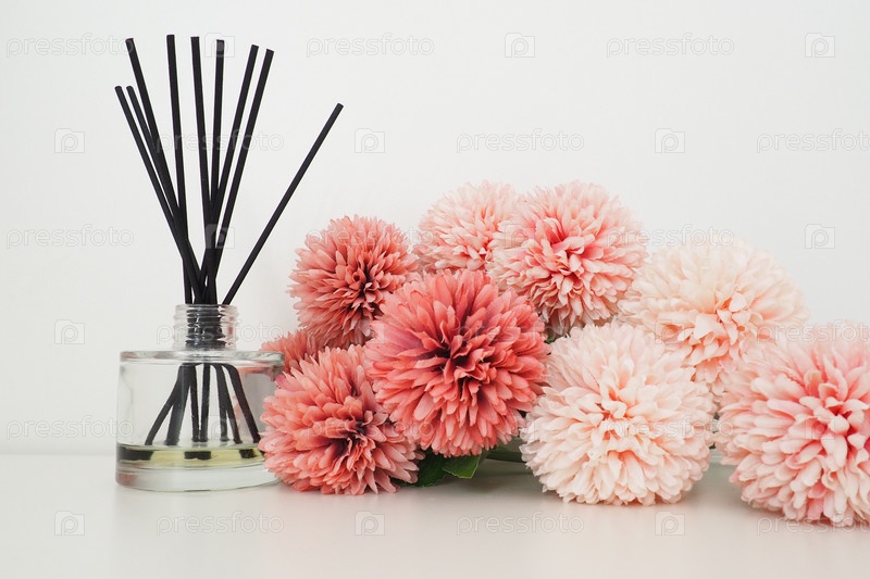 Композиция с ароматическими палочками, эфирным маслом в стеклянной вазе и розовыми махровыми искусственными цветами в интерьере белой комнаты. Белый фон. Много цветов и ароматических палочек