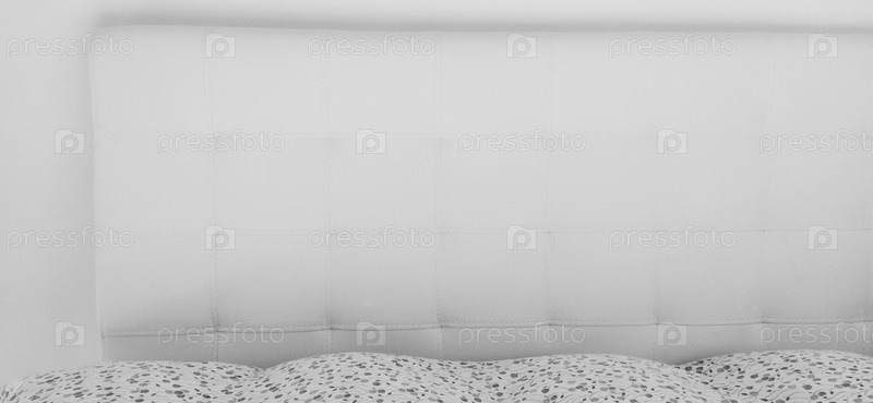Мягкое изголовье. Обивка для мебели из натуральной или искусственной кожи и стеганой ткани. Мягкое изголовье у светлой стены. Черно-белое монохромное фото