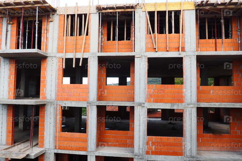 Красный керамический кирпич на строительной площадке. Керамоблок. Пустотелый кирпич. Строительство дома из красного кирпича. Материал для возведения стен и перегородок. Многоэтажное кирпичное здание