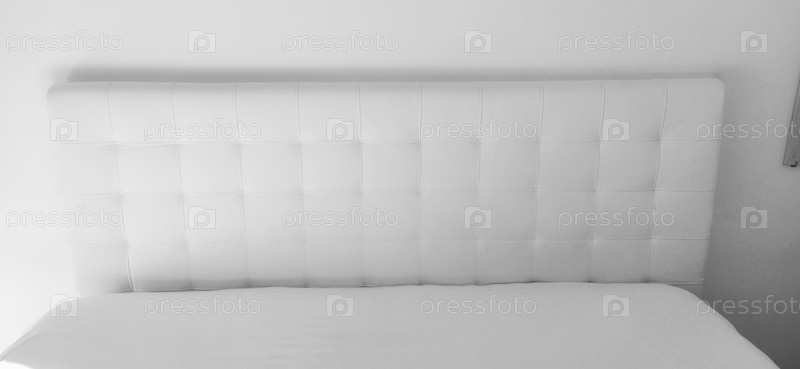 Мягкое изголовье. Обивка для мебели из натуральной или искусственной кожи и стеганой ткани. Мягкое изголовье у светлой стены. Черно-белое монохромное фото