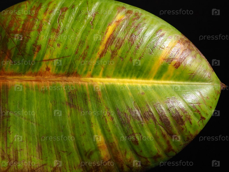 Фикус каучуконосный, или Фикус каучуконосный, вид растений из рода Фикус семейства тутовых семейства Морасовые. Большой, поврежденный лист фикуса крупным планом на черном фоне. Коричневые и желтые пятна и царапины