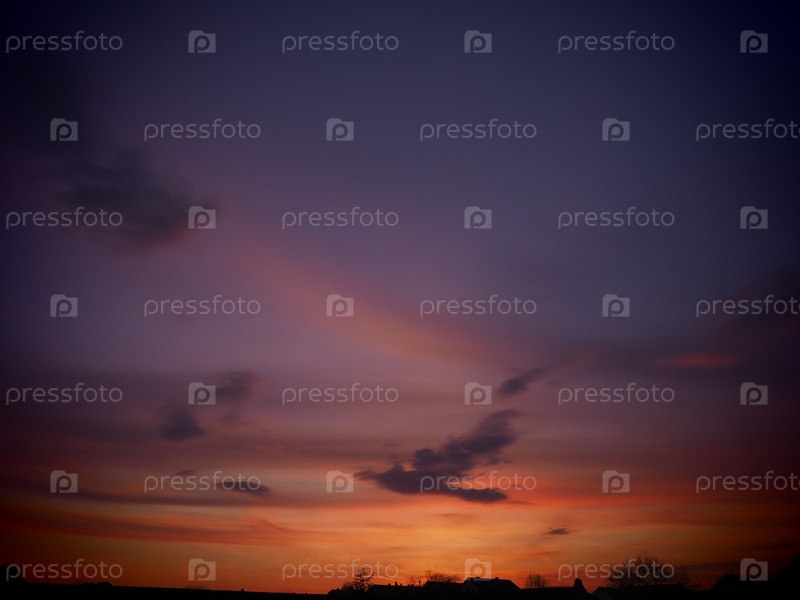 Красивый закат. Разноцветные легкие облака в лучах заходящего солнца над домами. Перьевые и кучевые облака. Хорошая погода. Розовый, оранжевый, фиолетовый, красный, желтый градиент неба