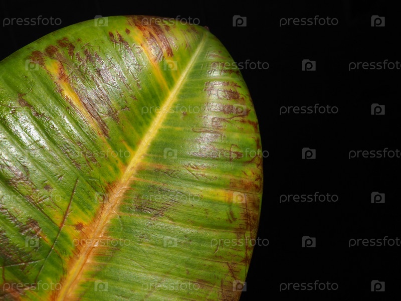 Фикус каучуконосный, или Фикус каучуконосный, вид растений из рода Фикус семейства тутовых семейства Морасовые. Большой, поврежденный лист фикуса крупным планом на черном фоне. Коричневые и желтые пятна и царапины