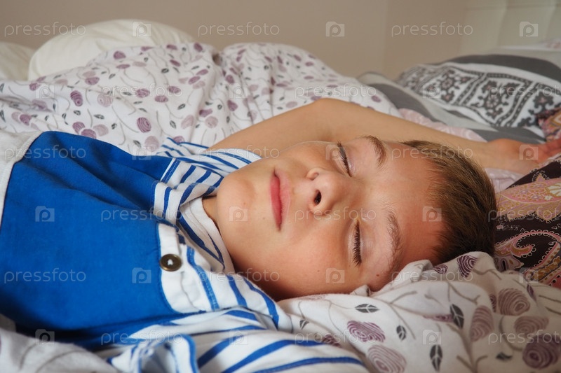 Красивый кавказский мальчик 10 лет со светлыми волосами, одетый в полосатую пижаму, спит на кровати с пушистым одеялом, обнимая подушку. Мягкий свет утреннего солнца льется в окно