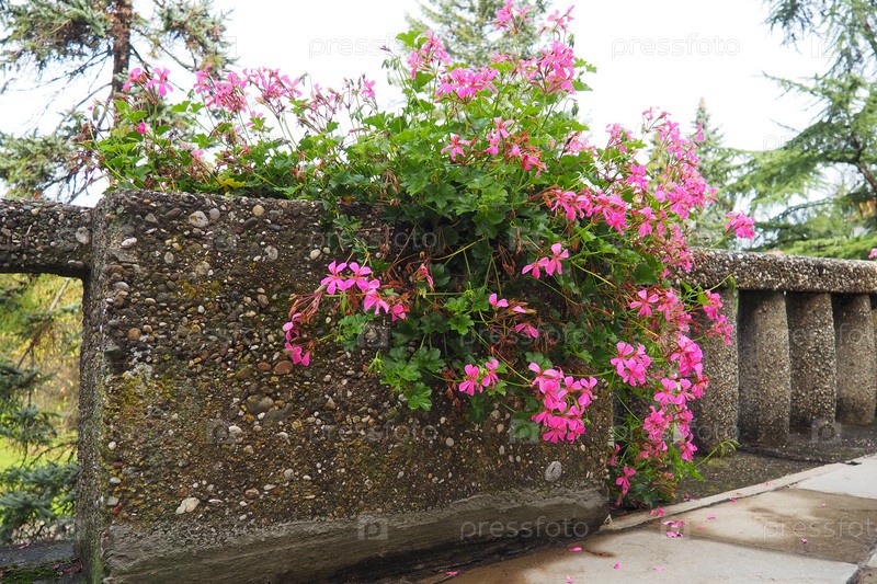 Цветущая розовая плющелистная герань пеларгония, вертикальный дизайн озеленения улиц и парков. Красивые крупные цветы герани пеларгонии герани. Цветоводство и садоводство. Баня Ковиляча