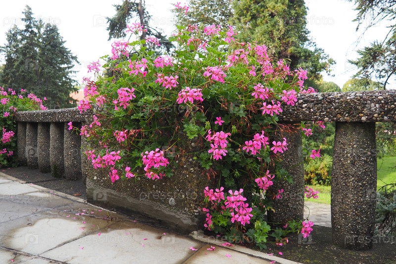 Цветущая розовая плющелистная герань пеларгония, вертикальный дизайн озеленения улиц и парков. Красивые крупные цветы герани пеларгонии герани. Цветоводство и садоводство. Баня Ковиляча