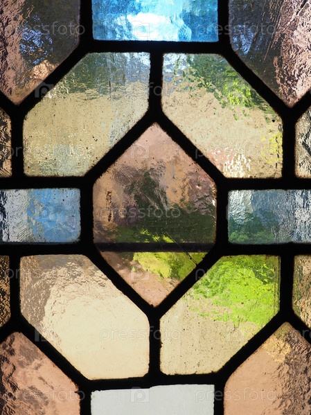 Окно со старинным витражом. Разноцветные кусочки прозрачного стекла. Красивое окно, через которое свет проникает в комнату. Украшение старой христианской церкви или храма